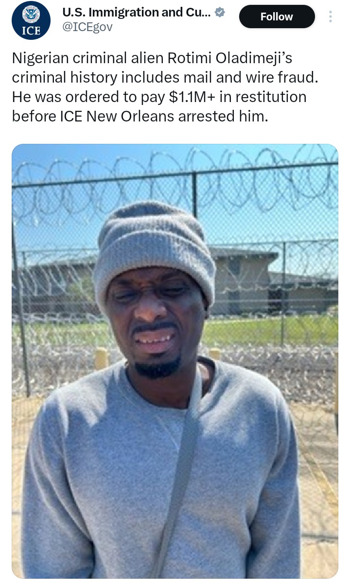 Posting a photo of Mr Oladimeji in a grey colour shirt and a headwarmer, ICE labelled him “criminal alien” from Nigeria.
